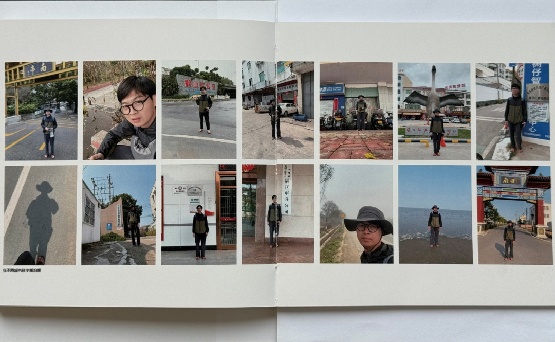 他一边讲一边翻开一本《徙步回家》的影像册,展示里面的路线图、票据、鞋面、脚掌。他说,“通风透气、走路飘飘的雷州拖鞋已经不仅仅是一个物品,它成了我身份、家乡与时间变迁的见证。”