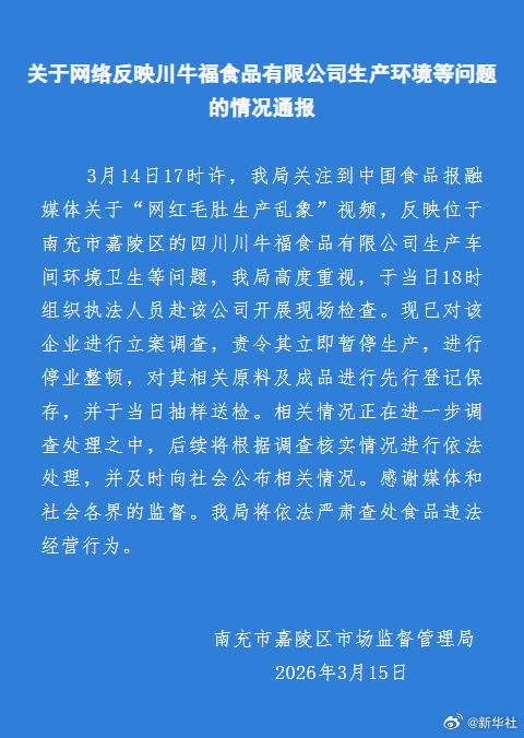 3月15日,四川南充市嘉陵区市场监督管理局针对关于“网红毛肚生产乱象”视频发布情况通报:已对川牛福食品有限公司进行立案调查,责令其立即暂停生产,进行停业整顿,对其相关原料及成品进行先行登记保存,并于当日抽样送检。 编辑 邓素凡 订阅后可查看全文(剩余80%)
