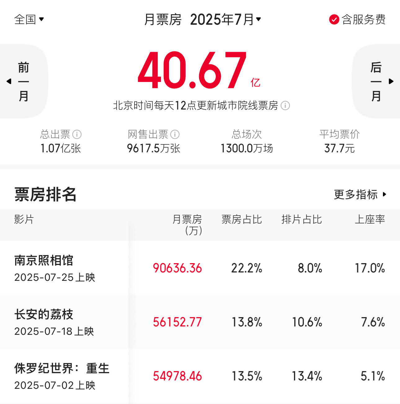 据网络平台数据,2025年7月全国电影票房达40.67亿元,观影人次超1.07亿,《南京照相馆》《长安的荔枝》《侏罗纪世界:重生》分列7月票房榜前三名。