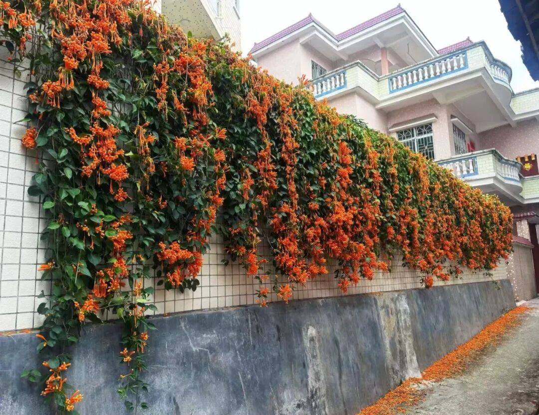 而横山镇大信村黄耀聪的庭院,则是另一番景致。在村里众多民居中,他家格外显眼,屋外围墙爬满了应节盛开的橙红炮仗花,路过的村民都忍不住驻足拍照。