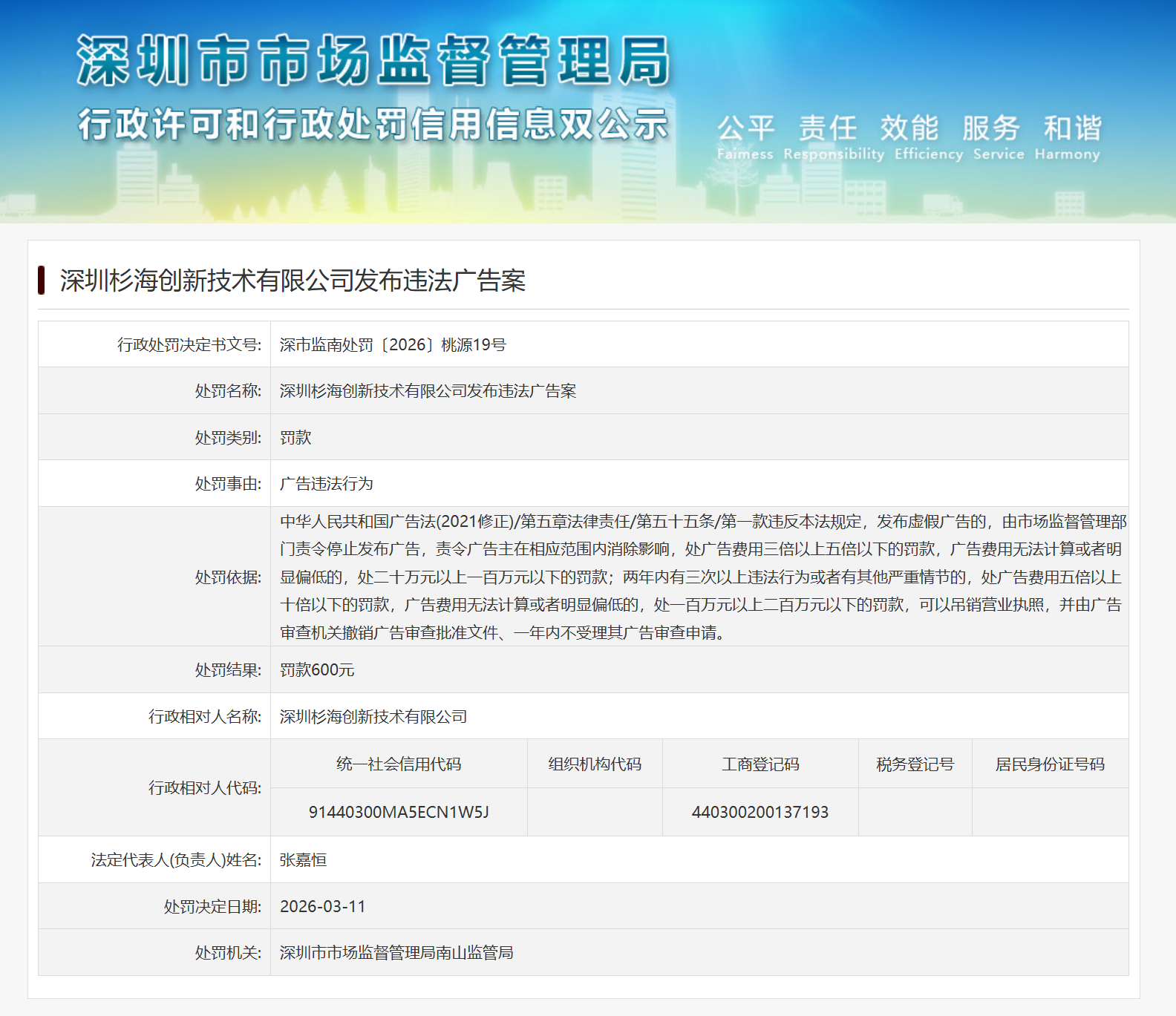 近日,深圳市市场监督管理局发布了一则行政处罚决定书,深圳杉海创新技术有限公司(下称“杉海创新”),因发布违法广告,被处以行政处罚,罚款600元。