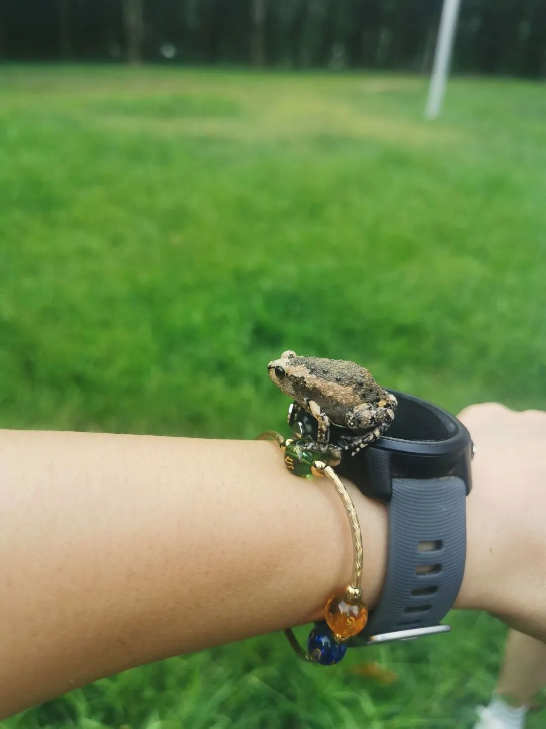 一只蛙爬到赵艳华手臂上。(受访者供图)