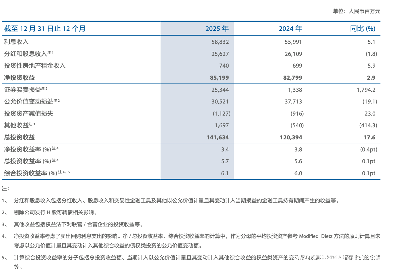 投资收益方面,2025年,中国太保集团实现净投资收益851.99亿元,同比增长2.9%,主要原因是利息收入的增长。总投资收益1416.34亿元,同比增长17.6%,主要原因是证券买卖损益大幅提升;受益于此,总投资收益率5.7%,综合投资收益率6.1%,同比均提升0.1个百分点。