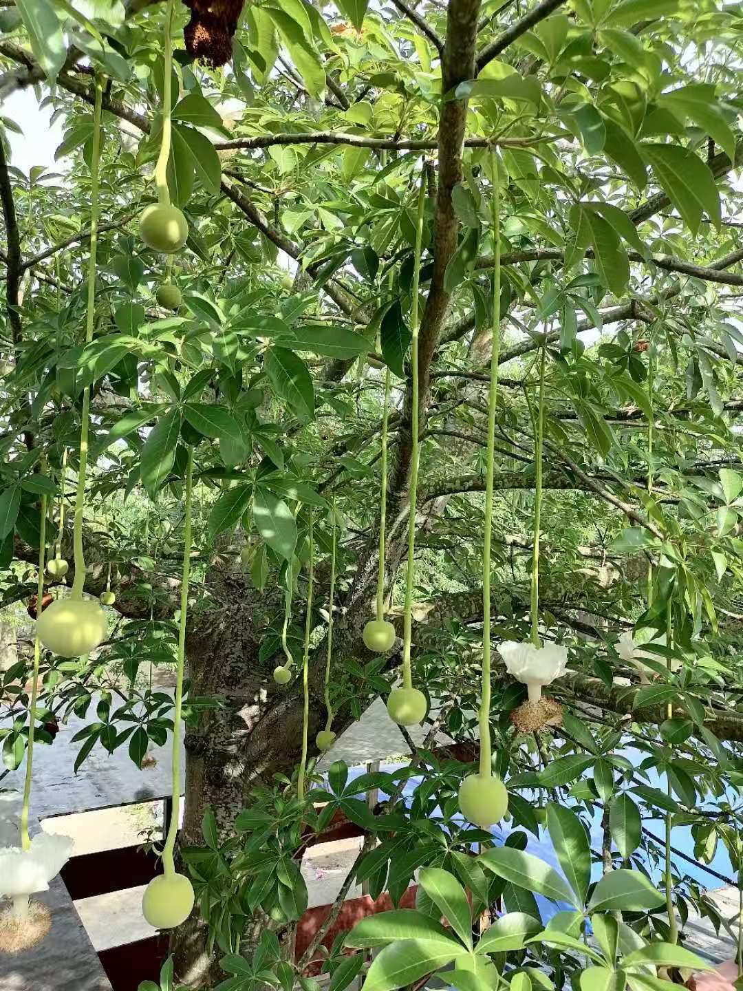 湛江麻章区千亩猴面包树林郁郁葱葱,其中一棵树上,挂满了沉甸甸的果实——两百多个果子压弯枝头,个个鲜重十余斤,比非洲千年古树结出的果实还要硕大。