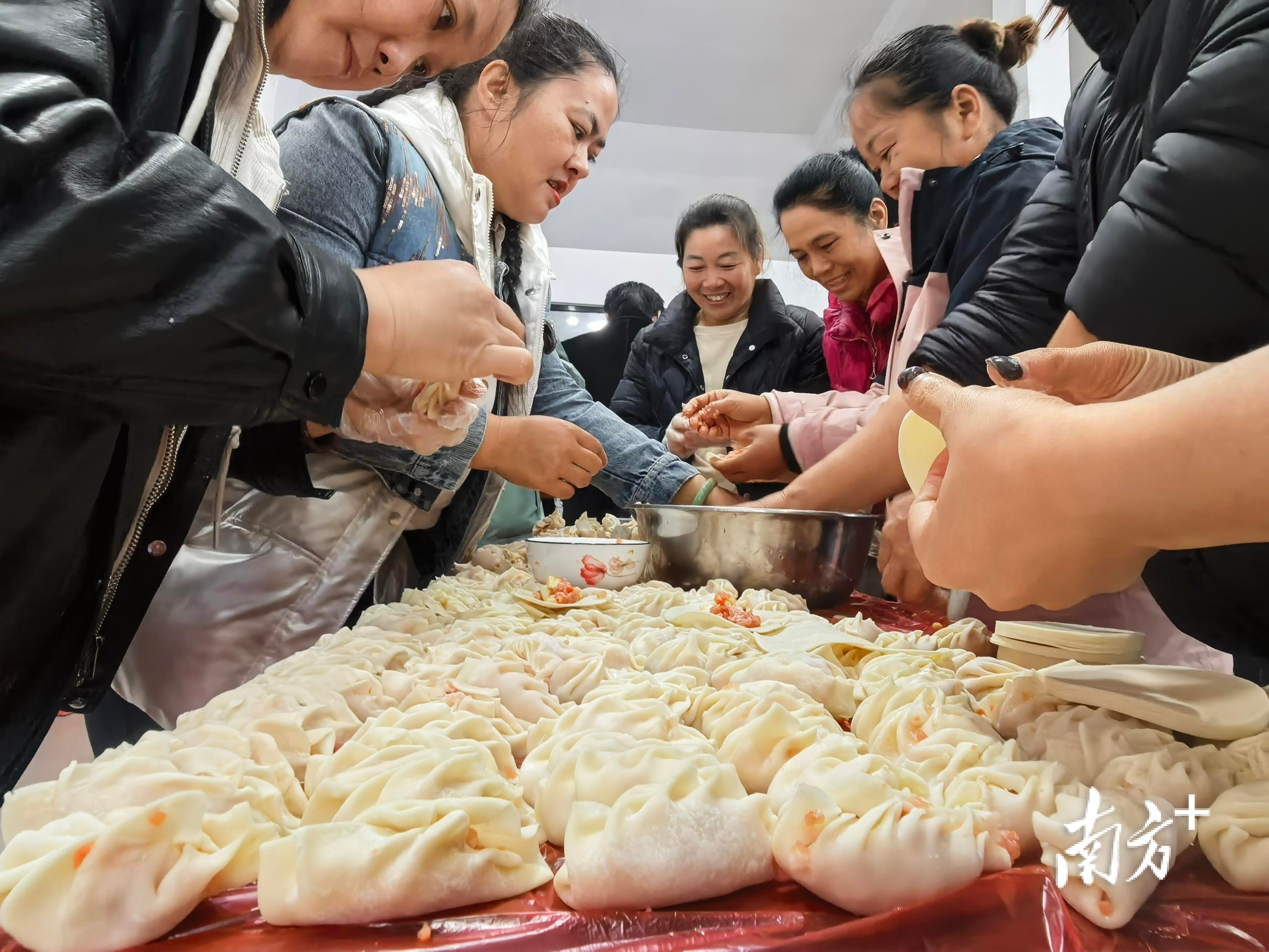 冬至将近,天气渐寒。连山壮族瑶族自治县福堂镇的乡村振兴孵化基地内却暖意融融。12月18日上午,10张长桌次第排开,镇村干部与村民指尖翻飞,雪白的面皮裹着翡翠馅料在掌中包成饺子。这场由福堂镇新时代文明实践所联合党群服务中心、文化站、妇联、社工等多方力量举行的“‘饺’暖冬至,‘旦’迎新年”特色民俗活动,是福堂镇深化“百县千镇万村高质量发展工程”(以下简称“百千万工程”)的生动实践,也是其依托的新时代文明实践阵地,持续丰富乡村文化生活的温情缩影。