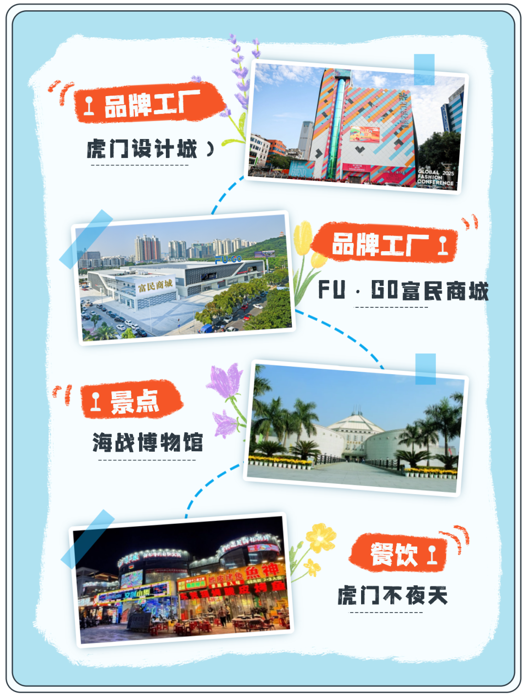 【第一日】:海战博物馆→威远炮台→好地方渔邨(午餐)→虎门设计城(AI服装体验)→FU·GO富民商城(女装、男装、新中式服饰、童装等)→新湾渔港特色海鲜围餐→中濠悦际酒店(东莞虎门君乐汇店)→虎门不夜天