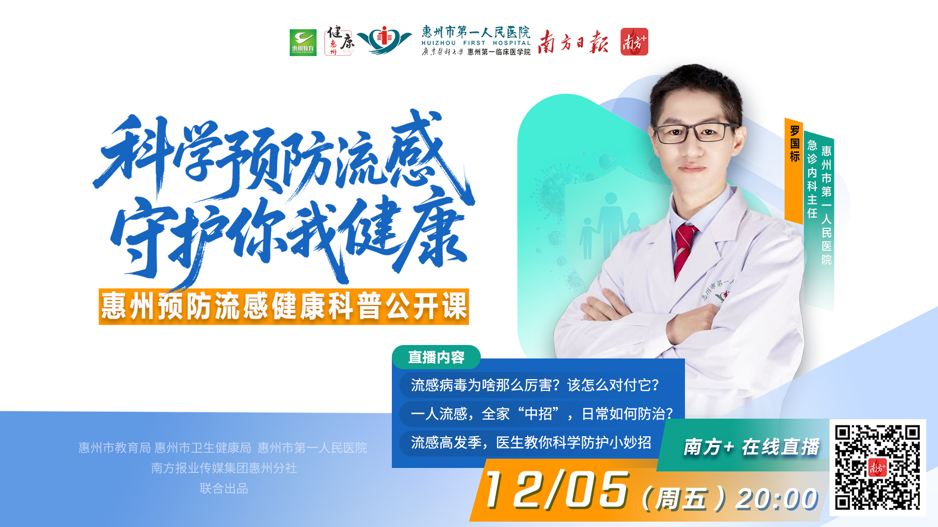 公开课将于12月5日(周五)晚上8点在南方+惠州频道播出。届时,惠州市第一人民医院急诊内科主任罗国标医生将分享预防流感的相关知识,欢迎大家收看。