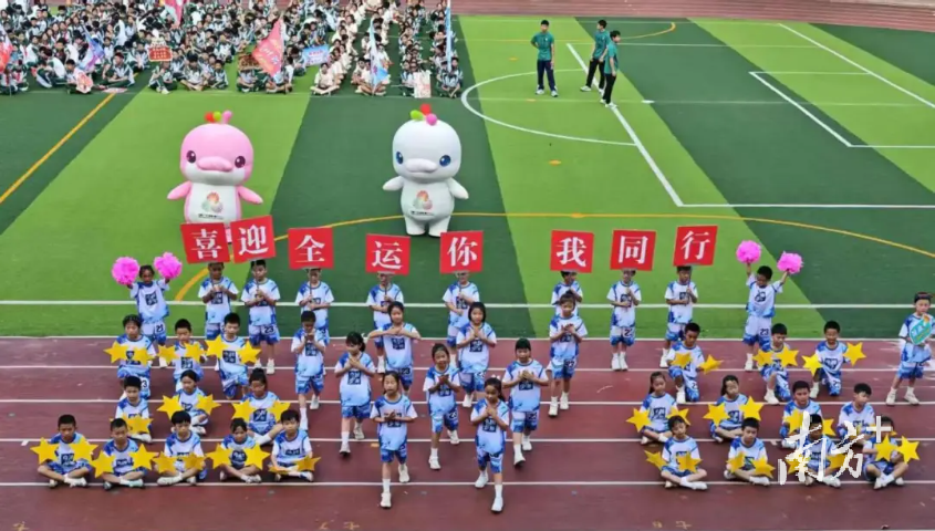 近日,一场主题为“赛场竞技显真我,全运追梦筑华章”的校园体育节在广州市黄埔区玉鸣小学的绿茵场上热闹启幕。开幕式现场,憨态可掬的全运会吉祥物成为全场“团宠”,一亮相就被同学们团团围住,“喜洋洋”“乐融融”与师生热情互动。而在广州市西关外国语学校,两只爆火出圈的吉祥物还携手该校新增的体育节吉祥物“西宝”共同入场,引得现场欢呼声不断。
