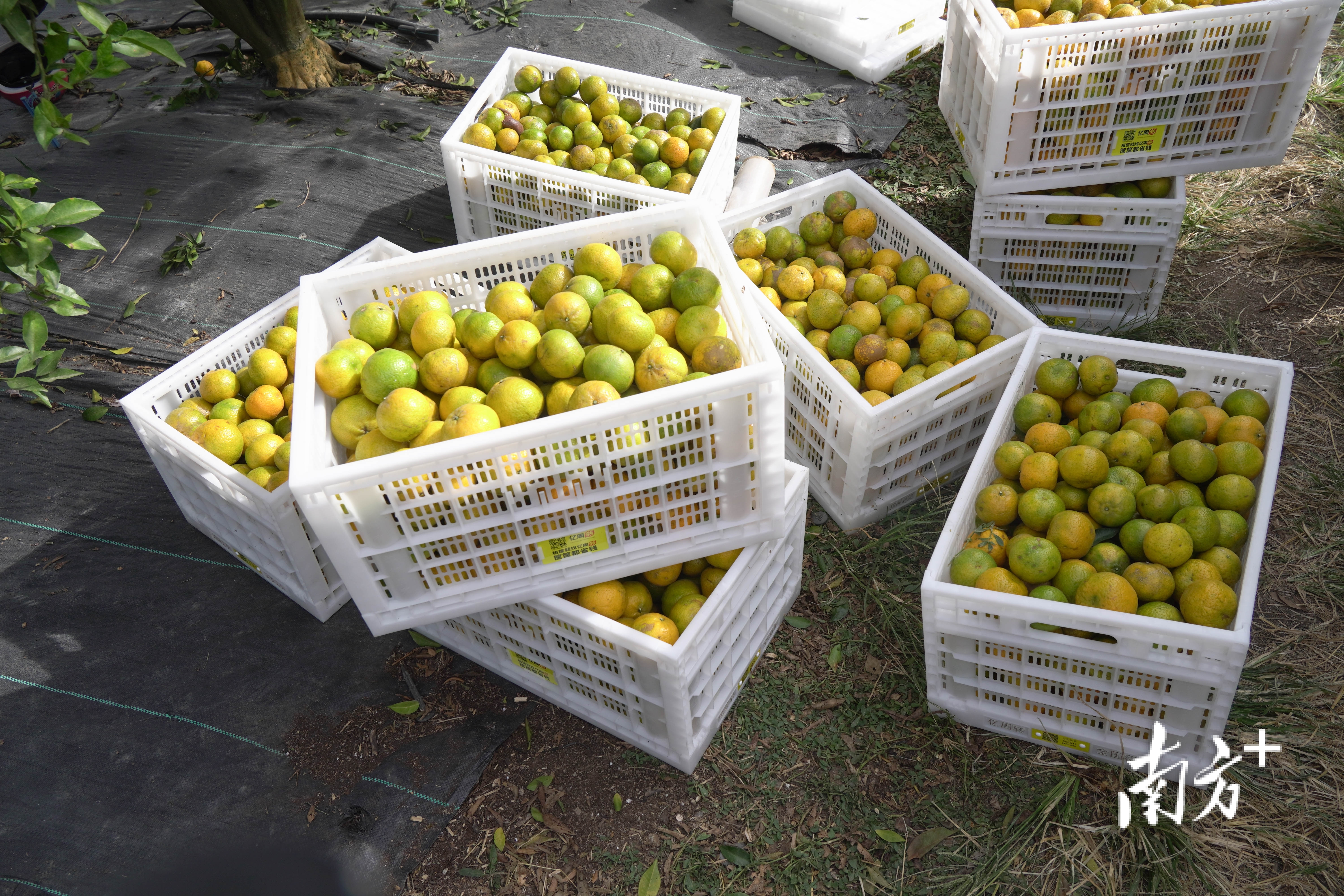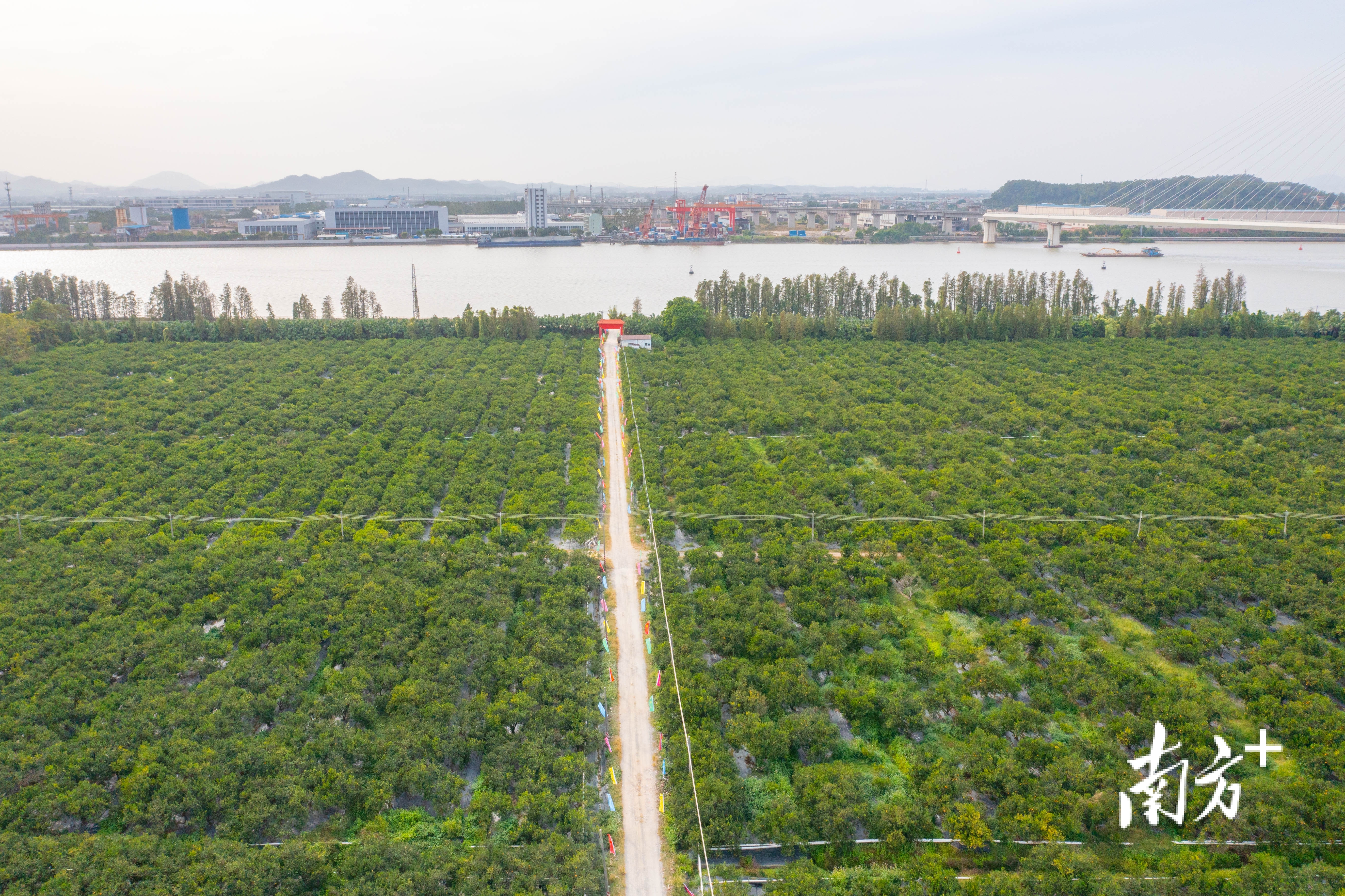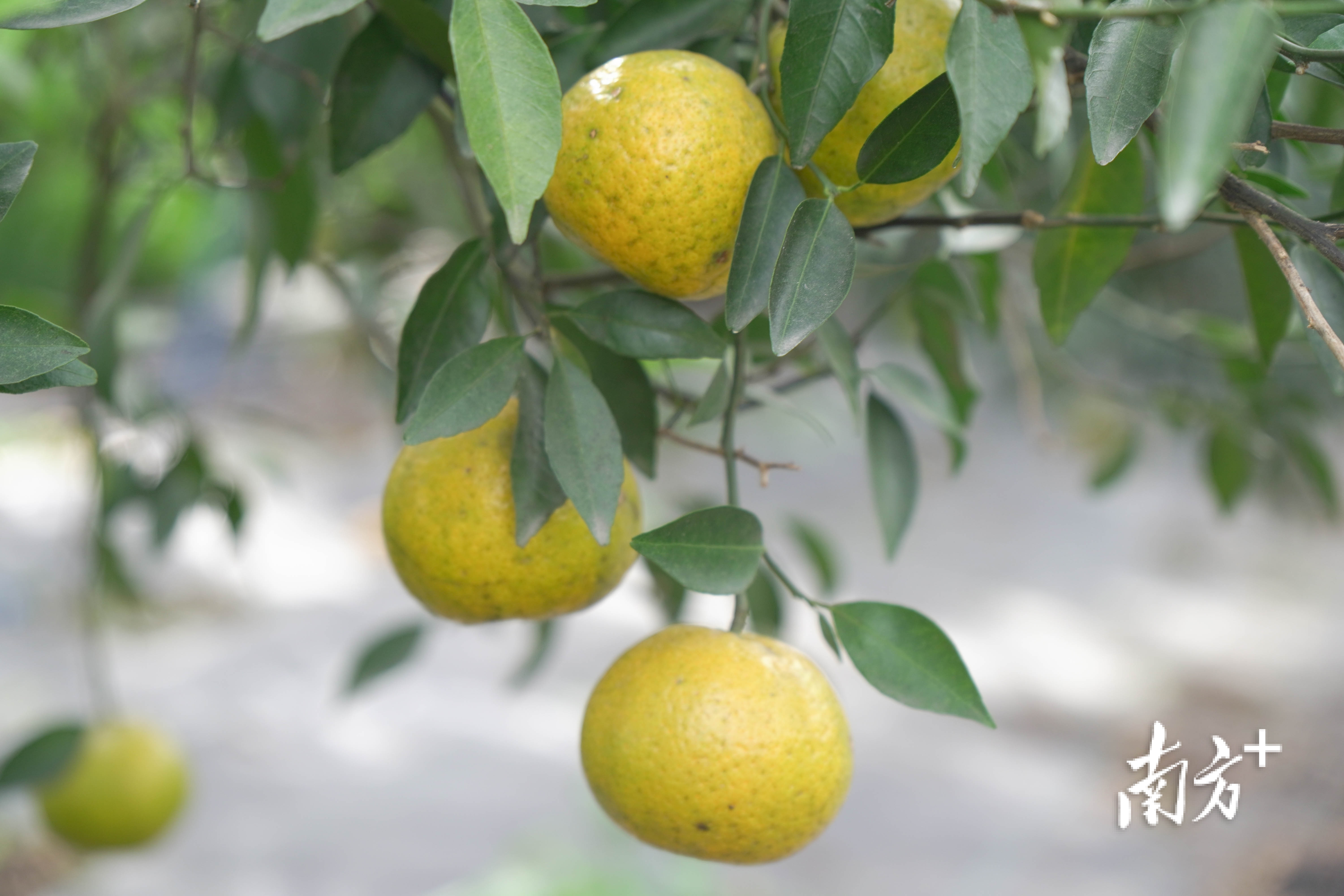 在新宝堂新会柑种植基地内,金黄柑果挂枝头。