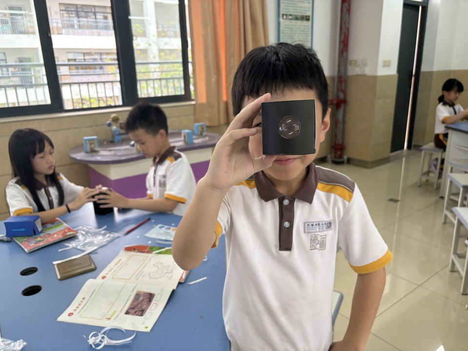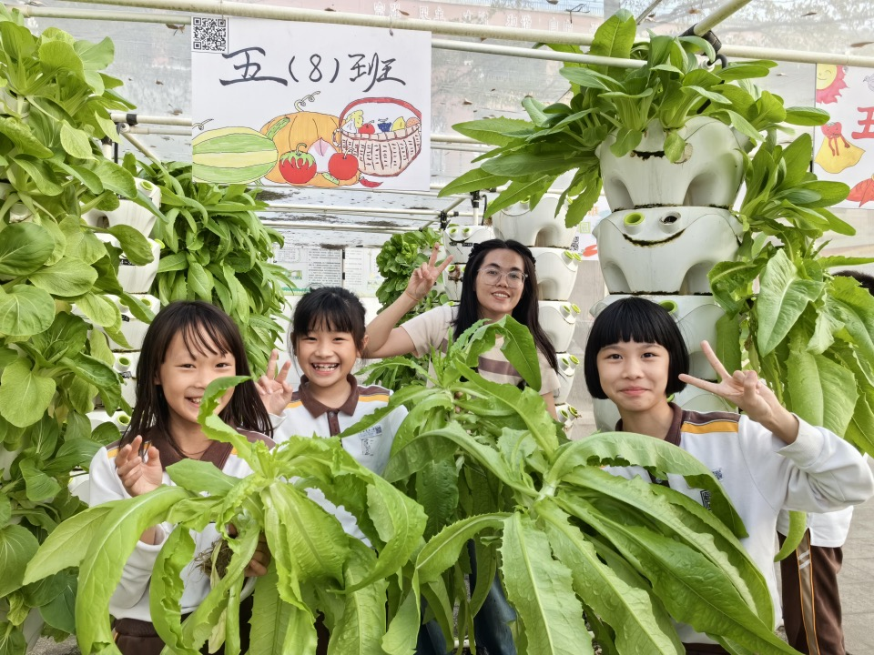 其中,在跨学科实践领域,“神奇的眼睛”未来课程广受学生喜爱。依托校内“爱眼小屋”与校外合作单位东莞爱尔眼科医院,学校带领学生探究眼睛结构、成像原理,通过动手制作简易照相机、开展“显微镜下的世界”实验,将生物、物理知识与AI技术启蒙结合,同时培养爱眼护眼习惯。而作为东莞市劳动教育基地,学校成立“未来农耕学院”,开辟“智慧种植园”,引进户外无土栽培智能系统,实现“菜园无人值守”,从催芽到采摘的全流程体验,让学生在劳动中见证科技对农业的赋能。