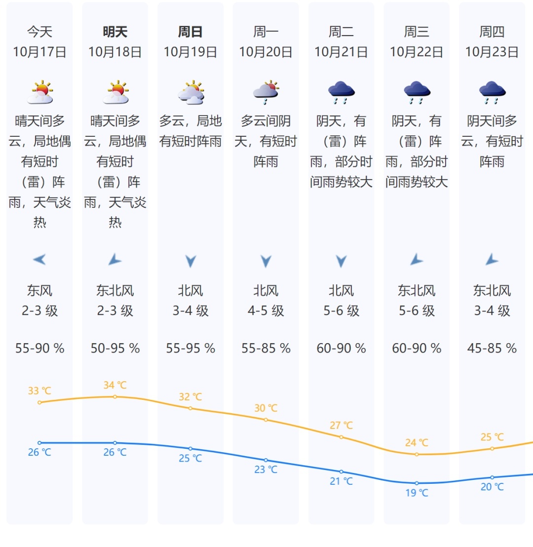 17-18日晴热为主,局地偶有短时(雷)阵雨,17日气温26-33℃,中北部和人口密集区局地最高气温35℃。