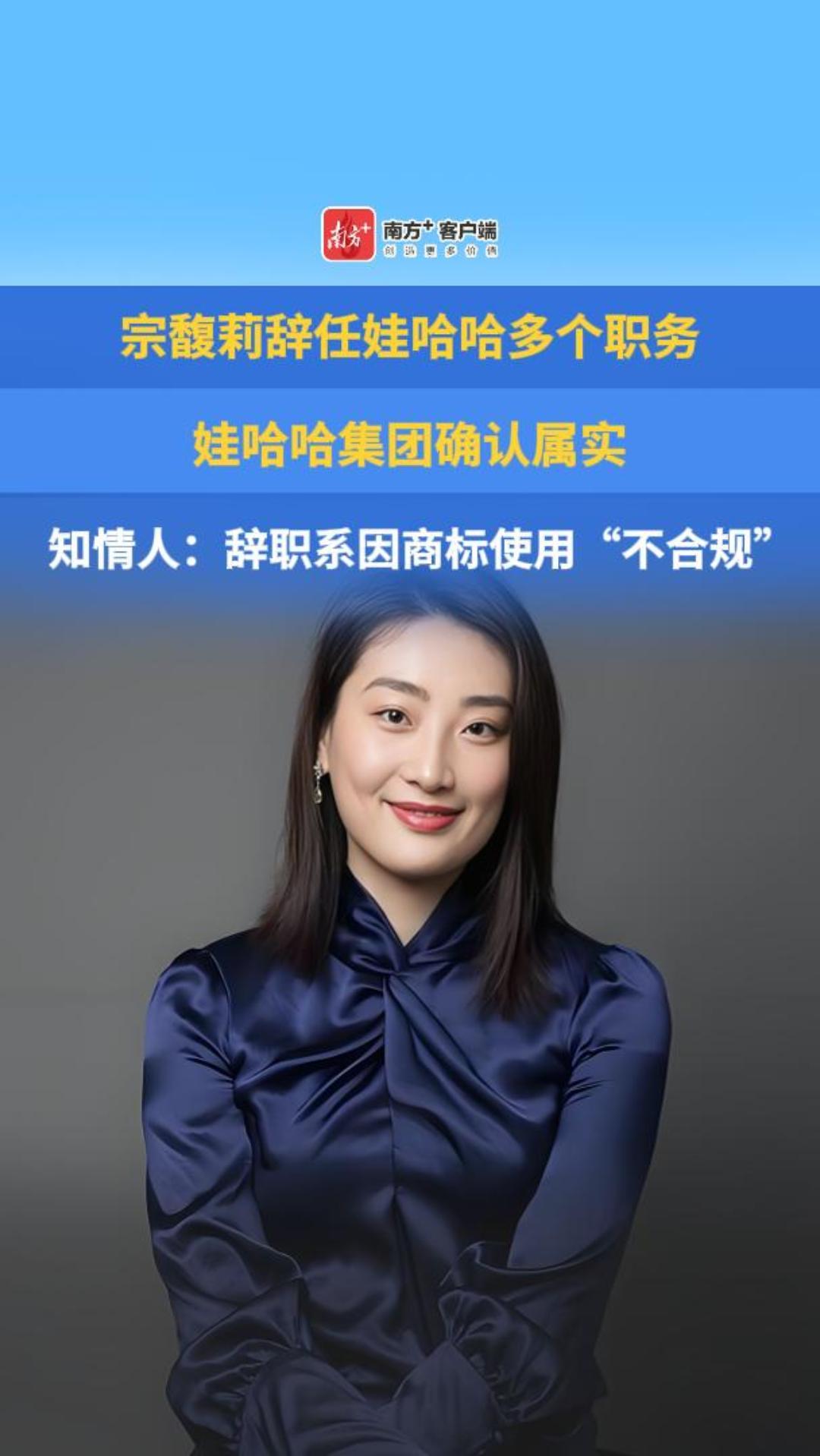 知情人士透露,宗馥莉已于9月12日向娃哈哈集团有限公司辞去多项职务。有消息人士表示,宗馥莉此次辞职,是因为商标使用“不合规”,宗馥莉决定经营自己的品牌“娃小宗”。今年5月12日,娃哈哈就通过官方账号发布了一款名为“娃小宗”的无糖茶新品。最新消息显示,娃哈哈集团召开董事会,除了通过宗馥莉辞职事项外,还任命许思敏为娃哈哈集团总经理,董事长职务空缺。详情>>