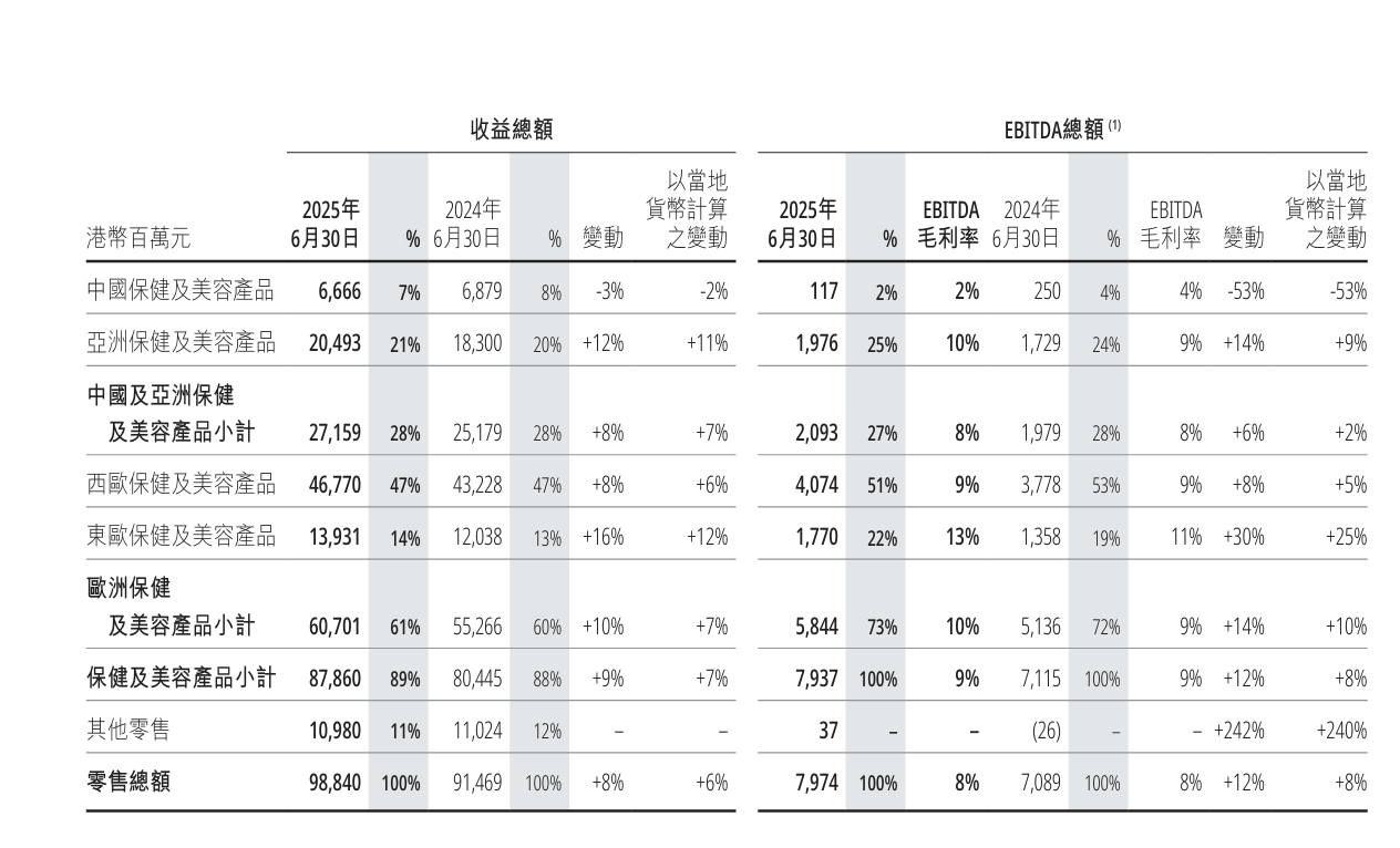 屈臣氏集团是全球最大的国际保健及美容产品零售商,拥有1亿7500万名会员。截至2025年6月30日,屈臣氏集团经营12个零售品牌,在全球31个市场经营16935家店铺,亚洲及欧洲保健及美容产品业务的店铺数目增长5%。其中,屈臣氏中国店铺数量为3630家,比去年同期的3775家,减少了145家,同比店铺销售额则下滑了1%。