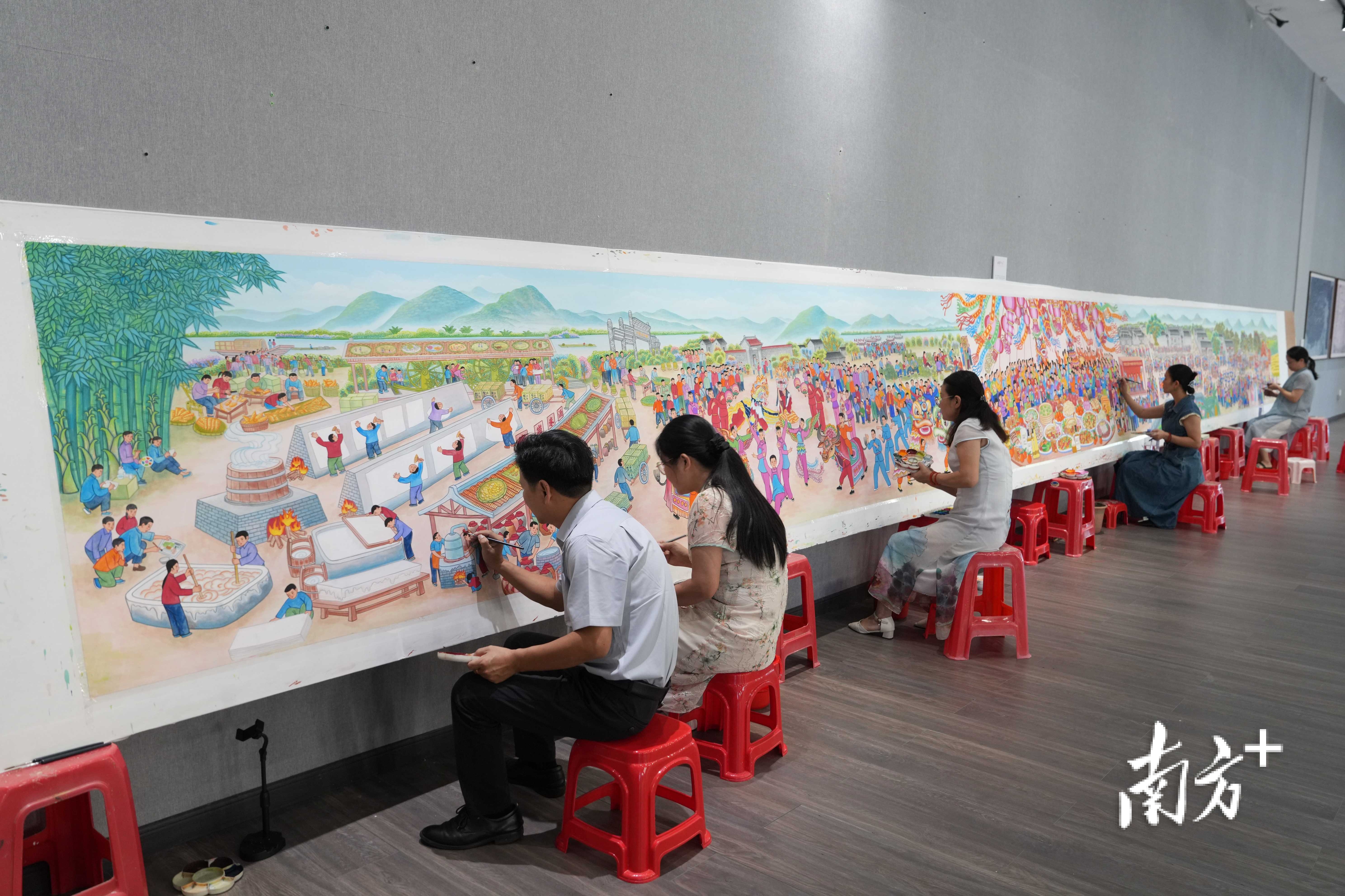 在龙门县档案馆一楼展厅,《龙门非遗长卷》正如火如荼创作中。这一长卷长13米、宽1米,由龙门农民画画家黄伟平主创,廖锦锋、苏晓明、梁彩欢、骆雪芳、刘少夏5名画家共同参与。据廖锦锋介绍,这一长卷是继《庚子年八方战疫图》《龙平渠·幸福渠》《百年梦想》等优秀作品后,龙门农民画又一幅长卷。长卷将龙门50多项省、市、县级非遗项目绘入其中,通过一个个群众欢庆的画面,热情讴歌新时代。这一长卷作品将在本月28号的龙门农民画助力环南昆山—罗浮山引领区建设作品展上正式亮相。