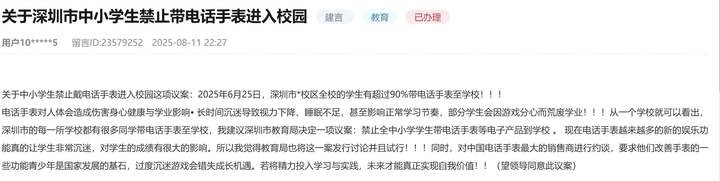 针对上述家长的建议,龙华区教育局表示后续将重点推进三项工作:一是结合上位法要求,细化校园智能终端产品管理指引,明确电话手表等产品的分类管理标准,指导学校制定可操作的细则;