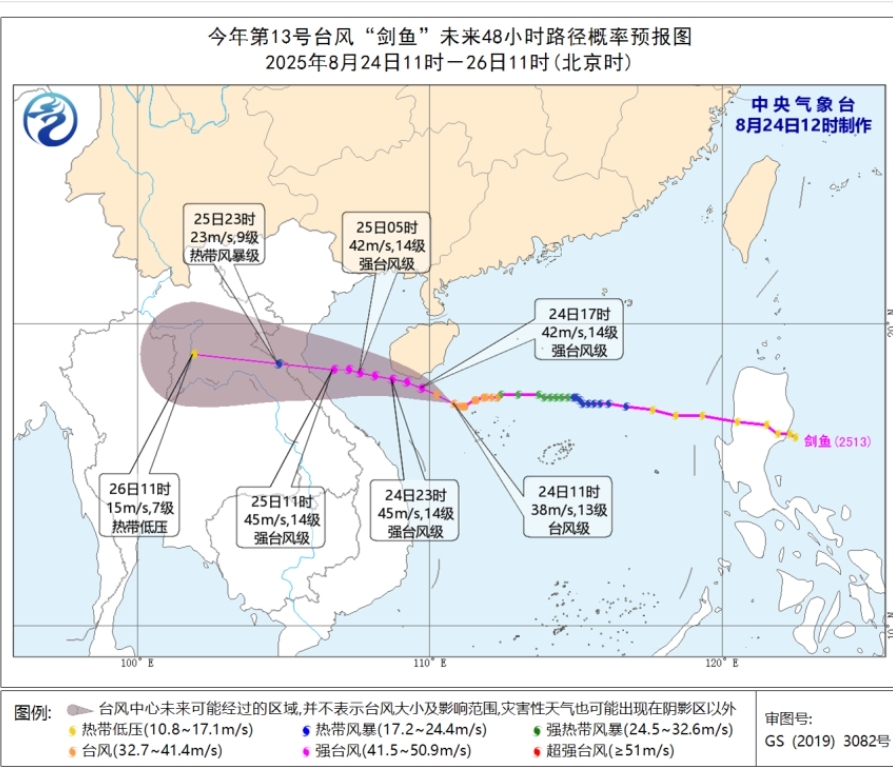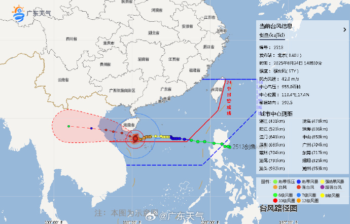 8月24日14时,台风“剑鱼”(强台风级)其中心位于距离海南省三亚市东南方向约135公里的海面上,也就是北纬17.4度、东经111.4度,中心附近最大风力14级(42米/秒),中心最低气压为955百帕。预计,“剑鱼”将以每小时20公里左右的速度向西偏北方向移动,强度变化不大。