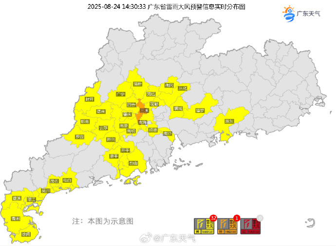 · 三水发布雷雨大风橙色预警,南沙、遂溪、清远、惠东等32个市县发布雷雨大风黄色预警。