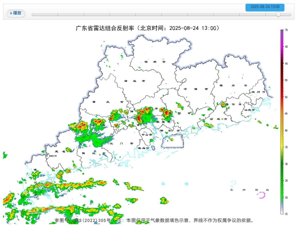 从天气雷达回波图看,截至24日13时,粤西南部、广东中部出现分散降雨。其中,广州除从化外的10区均发布雷雨大风黄色预警。