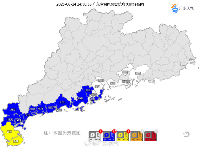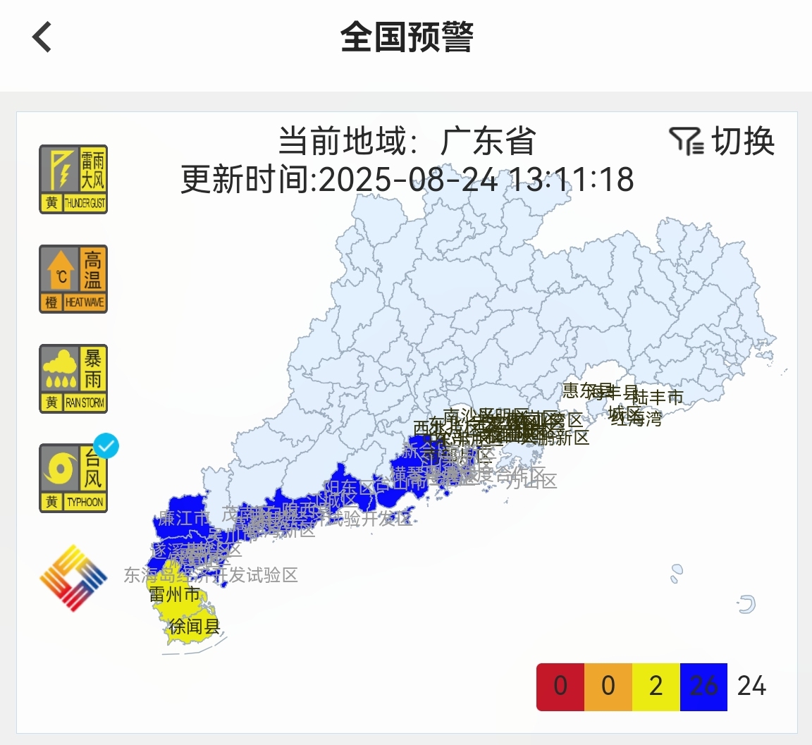 · 雷州、徐闻台风黄色预警生效,湛江、台山、珠海等12个市县台风蓝色预警生效,南沙、深圳、惠州等7个市县台风白色预警生效;