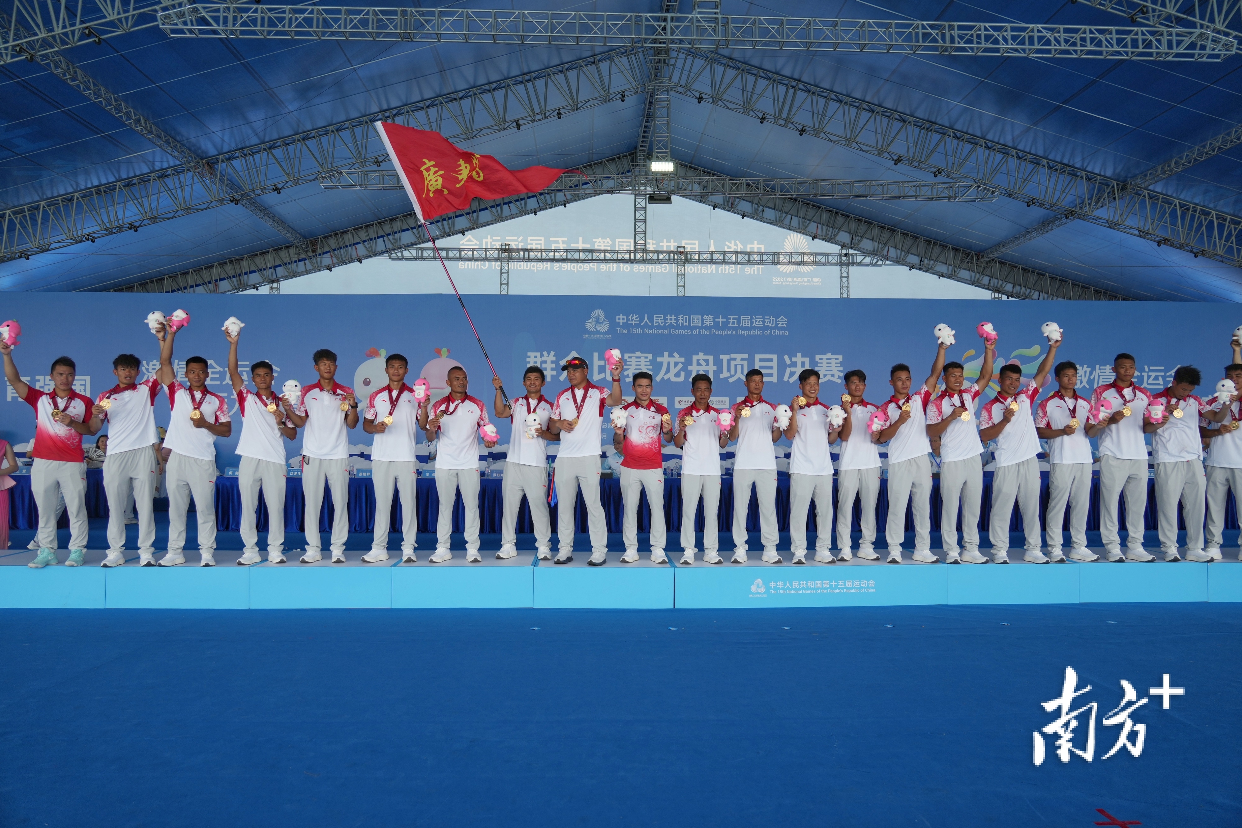 紧接着,在男子组(22人龙舟)100米直道赛中,广东代表队也凭借强劲的实力,以20秒36的成绩勇夺金牌。广西代表队夺得银牌,福建代表队夺得铜牌。