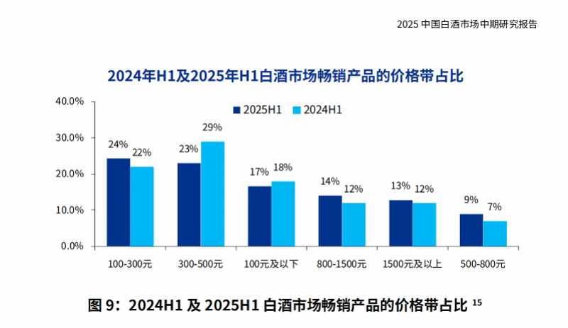 据《2025中国白酒市场中期研究报告》,2025年1-6月白酒市场经销商、零售商反馈市场动销最好的前三价格带分别为100-300元、300-500元、100元及以下;倒挂程度前三价格带分别为800-1500元、500-800元、300-500元。中低端畅销价位带由300-500元进一步向100-300元下沉,500-800元价位带产品生存则最为困难。