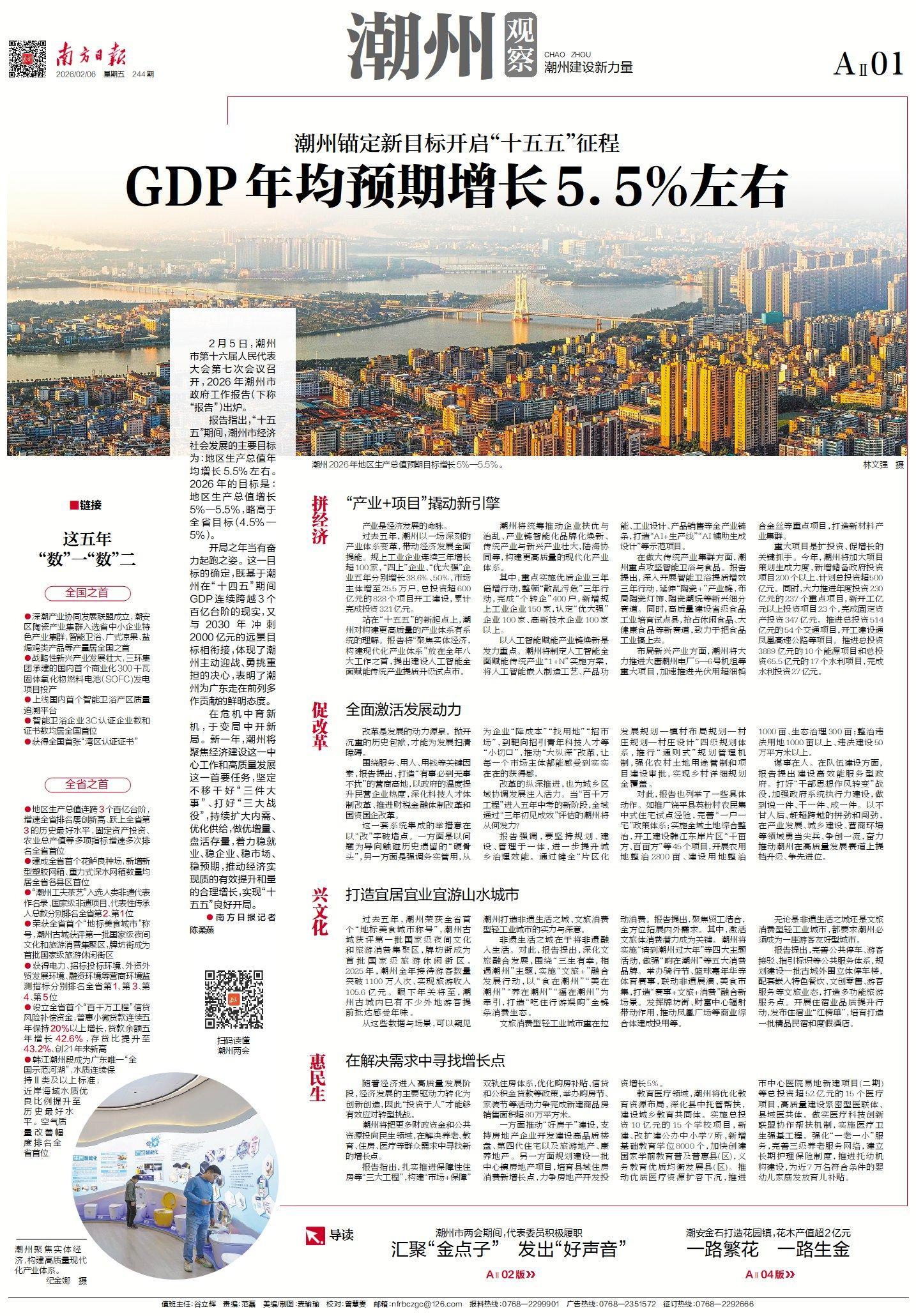报告指出,“十五五”期间,潮州市经济社会发展的主要目标为:地区生产总值年均增长5.5%左右。2026年的目标是:地区生产总值增长5%—5.5%,略高于全省目标(4.5%—5%)。