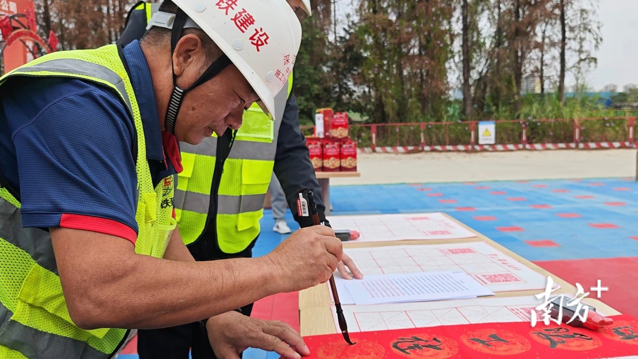 “我上学的时候练过书法,我小时候家里的对联都是我写的,现在是我的孩子来给家里写对联了。”彭雪刚说,自己是湖南人,来到项目上已经两年,家人都在湖南,21岁的孩子在长沙上学,两边几乎天天打视频电话,忙的时候就隔天打一次。春节前的工作即将完成,彭雪刚便买了2月11日从中山北站出发、经广州南站前往长沙南站的高铁票,仅需三个多小时就能和家人团聚。“虽然辛苦,但很幸福,能参与中山北站的建设,我很荣幸。”彭雪刚说。