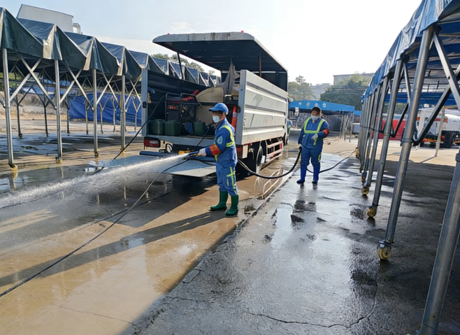 与此同时,大型清洗车辆也纷纷上路。自12月25日起,11辆大型水车和76辆高压清洗车昼夜运作,水柱冲击下的路面焕然一新,累计清洗面积达1.86万平方米。在大江路车场,7名卫生监督员正对3座移动公厕进行细致擦洗,确保这些高频使用的设施洁净如新。