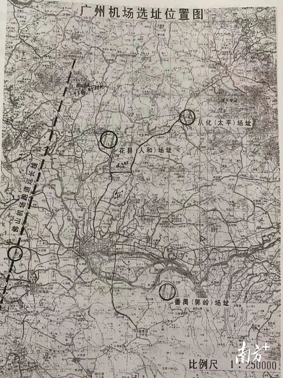 新机场选址何地?成为当时争议焦点。1993年广州启动新机场选址立项研究,候选方案涵盖花县、番禺(郭岭)、从化(太平)等地。