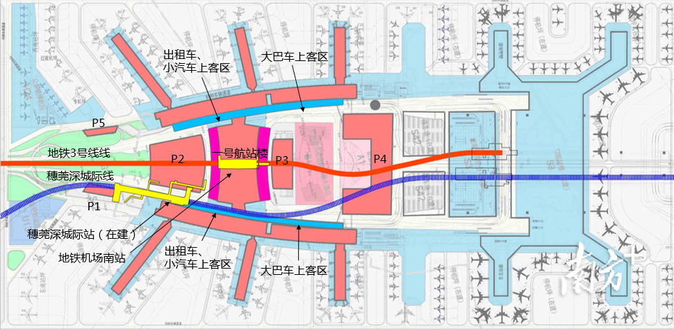 高铁入站——首期将广河高铁、广珠澳高铁引入T3航站楼,未来还将引入广深高铁新通道、广清永高铁、贵广高铁广宁联络线等共6条高铁。
