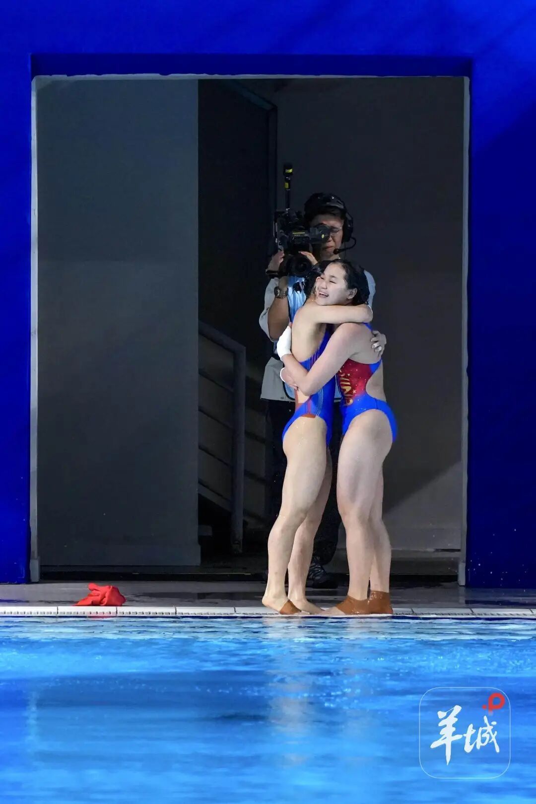 全红婵和王伟莹拥抱庆祝。羊城晚报记者 梁喻 摄