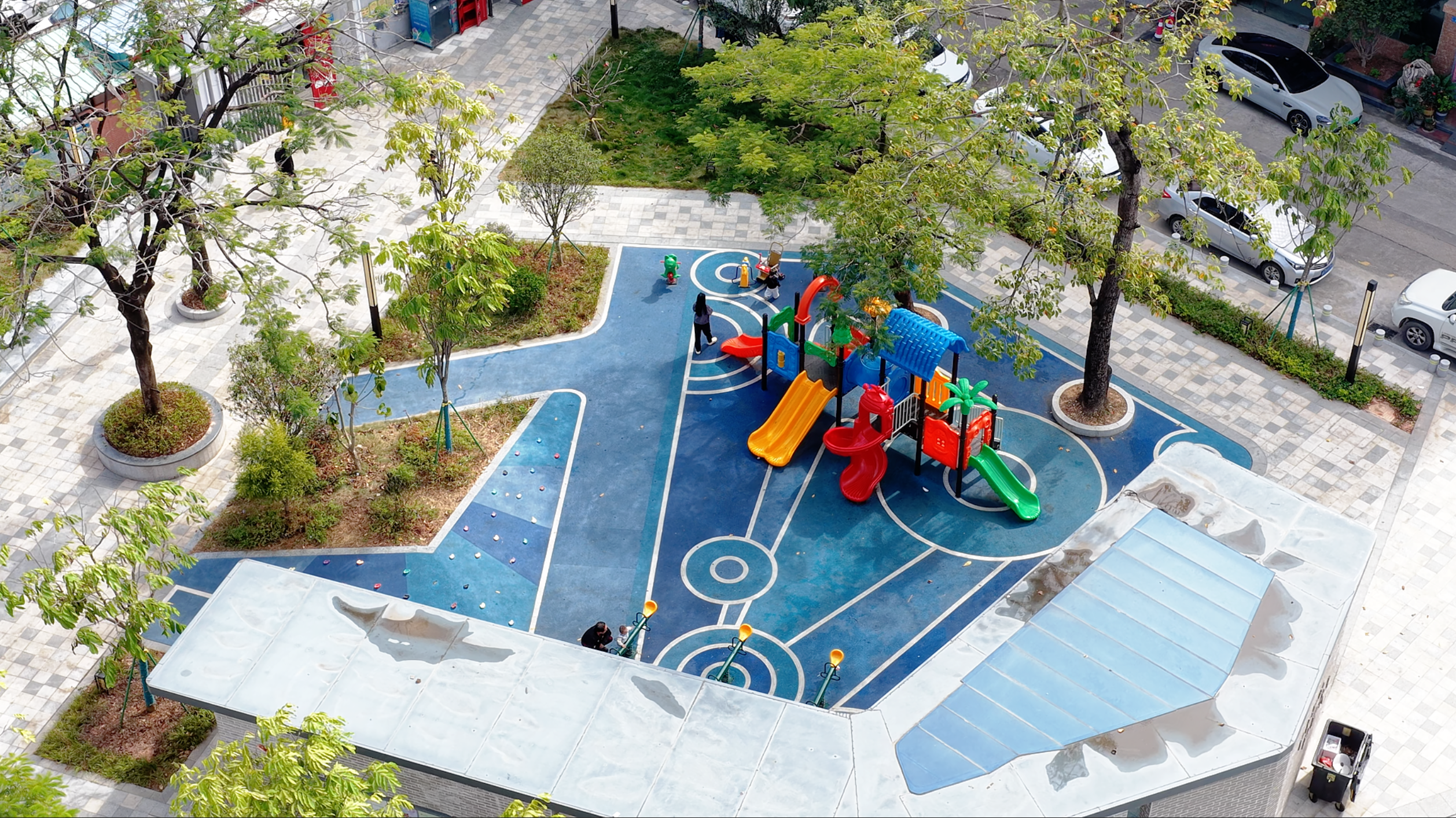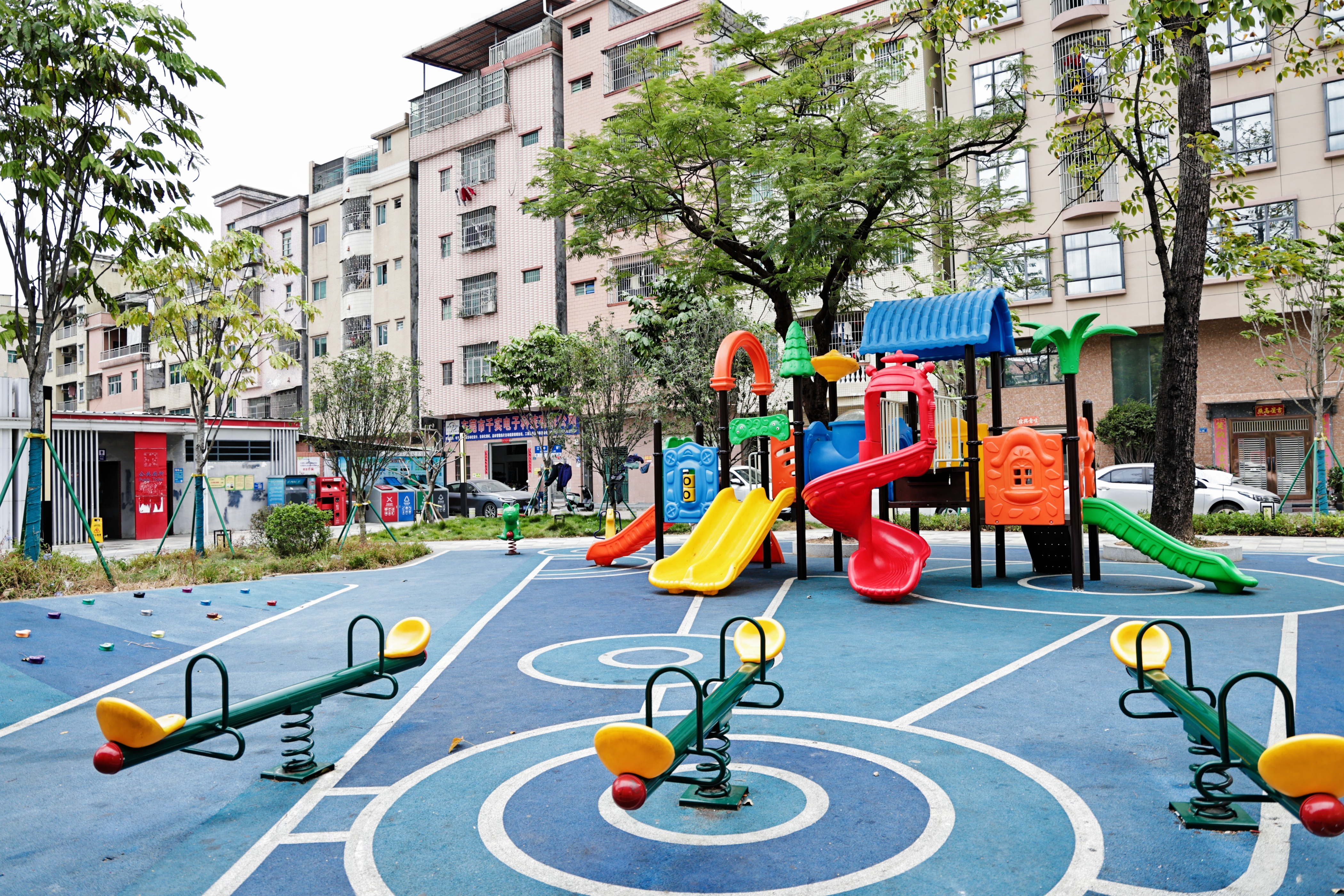 崭新的儿童游乐场成为社区里最温馨的角落。色彩明快的滑梯旁,孩子们尽情玩耍,家长们在一旁悠闲看护。