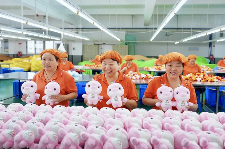 在东莞的文博工艺品有限公司生产车间里,流水线高速运转,工人加班加点赶工,一箱箱封装完毕的吉祥物周边正排队上货柜。