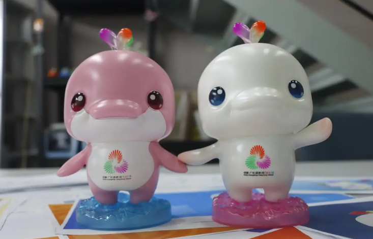 作为粤港澳联合承办的本届全运会的吉祥物,它们以中华白海豚为原型,头顶木棉红、紫荆紫、莲花绿水柱,暗藏三地融合深意。