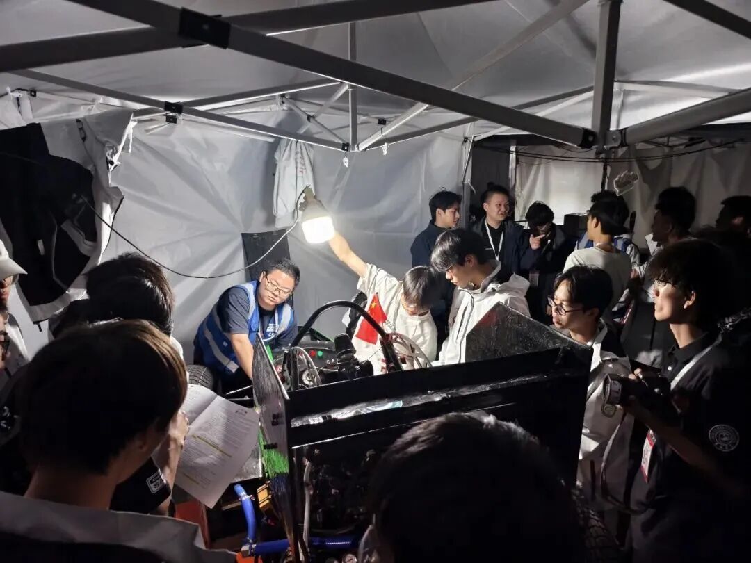 风雨交加中,赛况逐渐焦灼。为保护赛车精密电子系统免受雨水影响,十几名队员共同高举防水棚,为赛车撑起 “安全区”。