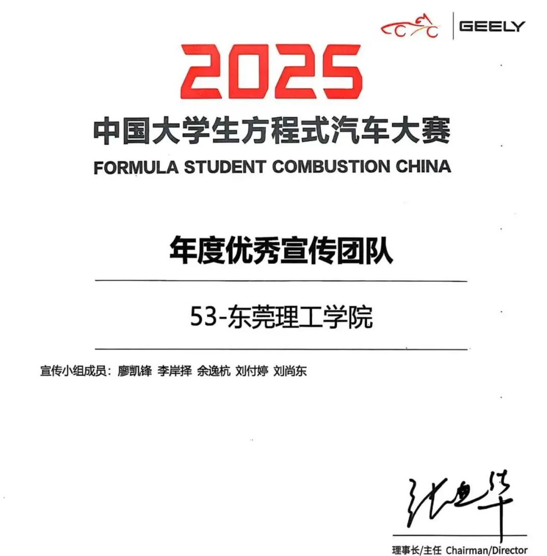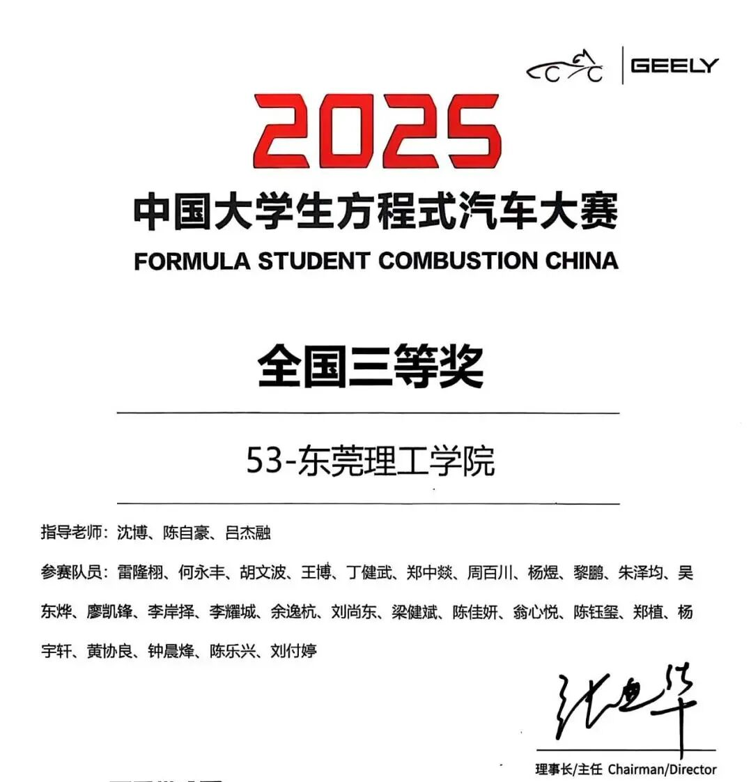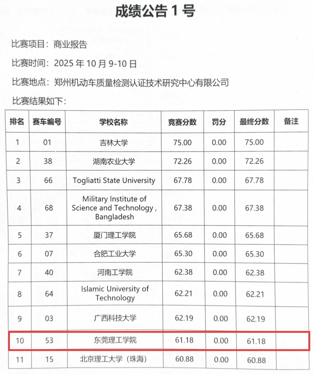 经过5天激烈的角逐,莞翎D_racing车队顺利完成车检、动态赛、商业报告等全部项目,首次圆满完赛,创造了东莞高校车队的历史性突破。其中,空气动力学设计斩获全国第七,商业报告斩获全国第十,最终拿下全国三等奖的佳绩。