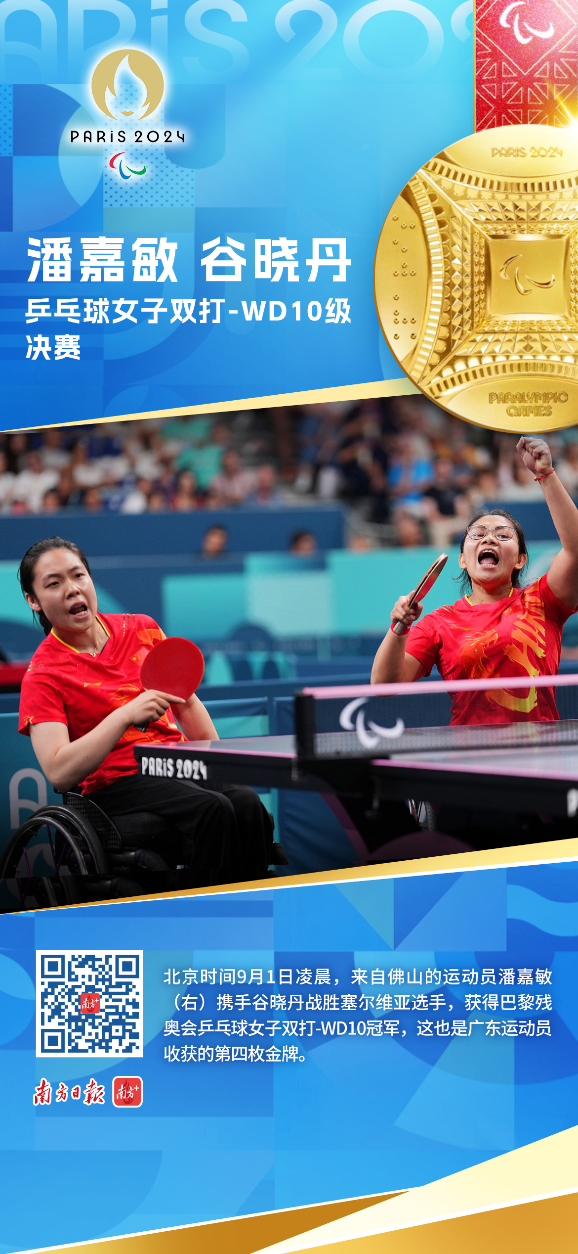 当地时间8月31日下午,北京时间9月1日凌晨2时许,南巴黎竞技场传来喜讯,广东佛山选手潘嘉敏携手谷晓丹战胜塞尔维亚选手,获得巴黎残奥会乒乓球女子双打-WD10冠军。比赛中,潘嘉敏沉着应战,在打出总比分1:1之后,连胜两局,为广东夺得第四枚金牌。