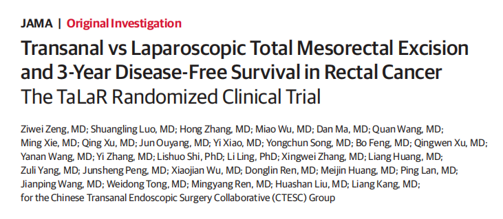 北京时间2025年1月24日,国际顶级医学期刊《美国医学会杂志》(The Journal of the American Medical Association,JAMA,影响因子63.1)在线发表了题为:Transanal vs Laparoscopic Total Mesorectal Excision and 3-Year Disease-Free Survival in Rectal Cancer The TaLaR Randomized Clinical Trial的文章,这是由中山六院荣誉院长、结直肠外科汪建平教授,副院长、结直肠外科康亮教授团队牵头组建的中国经肛腔镜外科研究协作组(Chinese Transanal Endoscopic Surgery Collaborative,CTESC Group),在经肛全直肠系膜切除术(transanal total mesorectal excision,taTME)治疗直肠癌方面的最新研究成果。(文末点击“阅读原文”跳转论文链接)