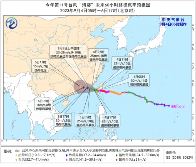 中央气象台9月4日6时发布台风黄色预警,今年第11号台风“海葵”(HAIKUI)的中心已于昨天(3日)晚上7时50分前后移入台湾海峡南部海面,晚上8时由强台风级减弱为台风级。今天(4日)早晨5时,进一步减弱为强热带风暴级,其中心早晨5时位于台湾省高雄市近海海面中心附近最大风力有11级(30米/秒),中心最低气压为975百帕。