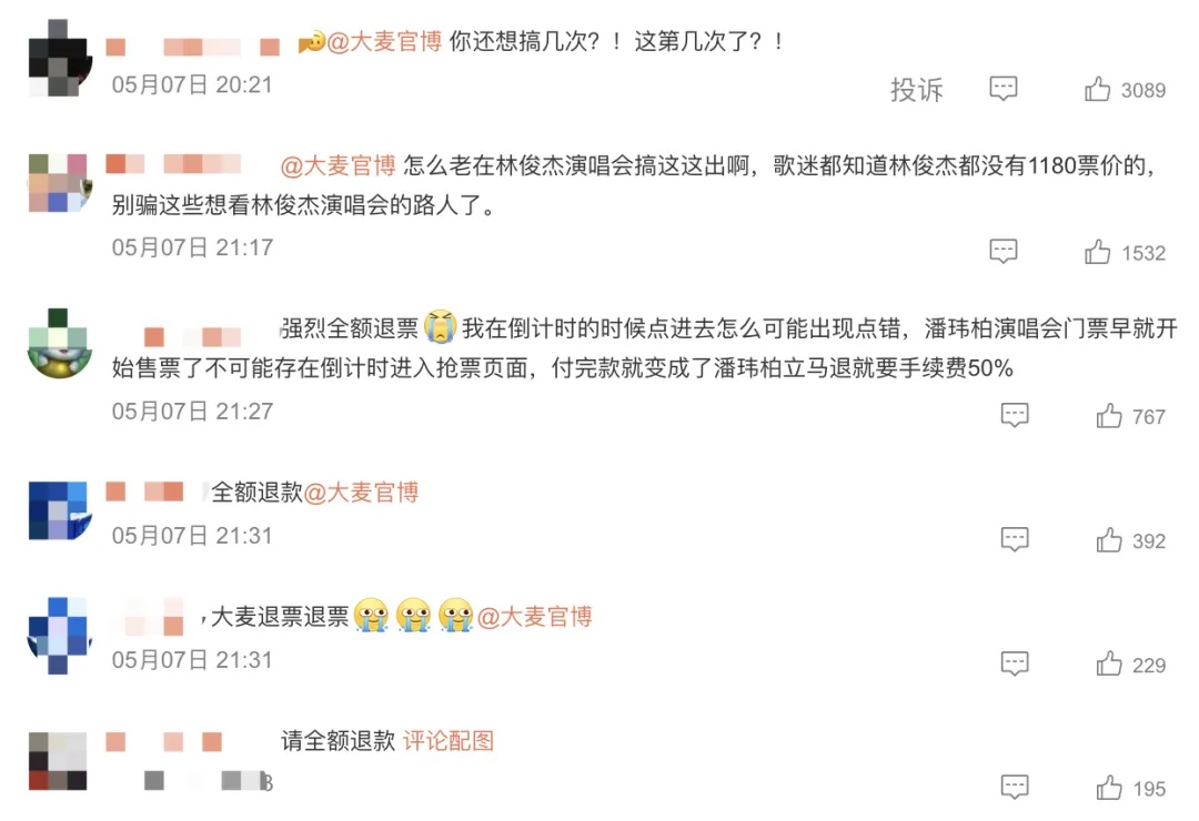 报道发出后,不少网友在评论区喊话大麦平台全额退票。