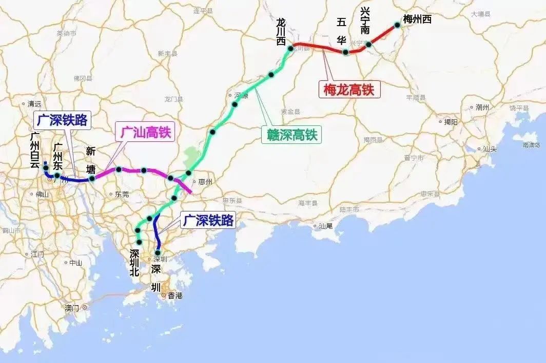 梅龙高铁位于梅州和河源两市境内,是广东省境内连接梅州市和河源市龙川县时速350公里的高速铁路,正线全长95.6公里,全线设梅州西、兴宁南、五华、龙川西4个车站。