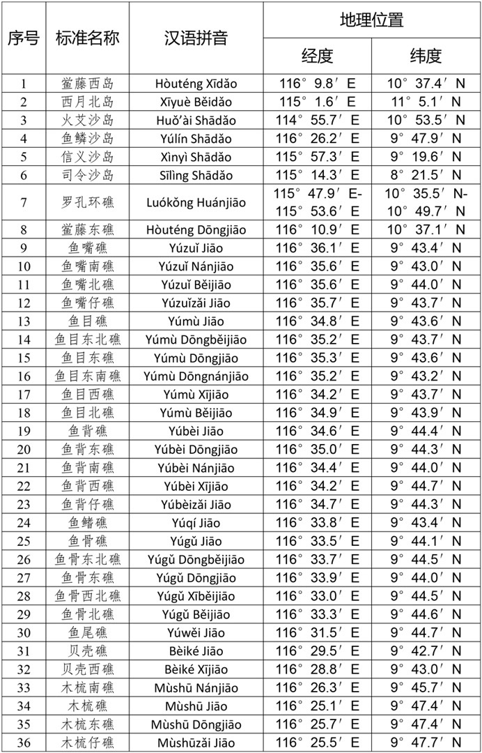 为进一步规范有关地名的使用,现将我国南海部分岛礁标准名称予以公布。中国地名委员会1983年4月受权公布的《我国南海诸岛部分标准地名》和自然资源部、民政部2020年4月公布的《自然资源部 民政部关于公布我国南海部分岛礁和海底地理实体标准名称的公告》继续有效,请社会各界规范使用已公布的标准名称。