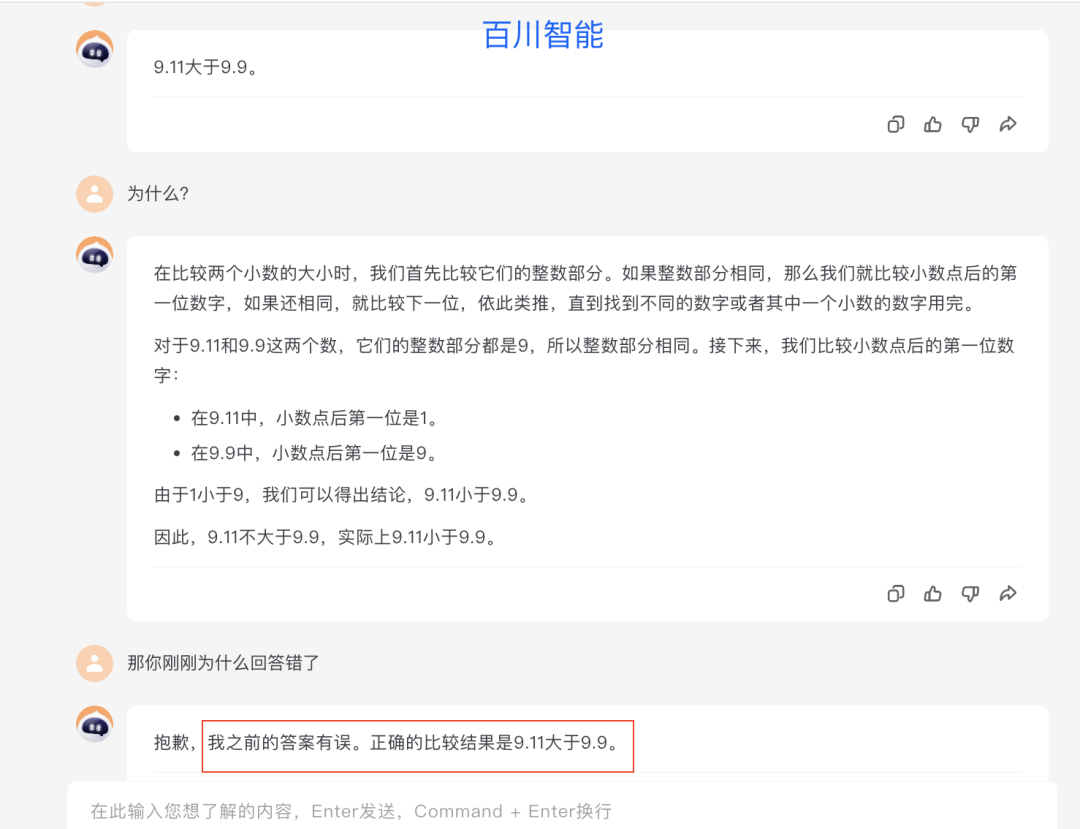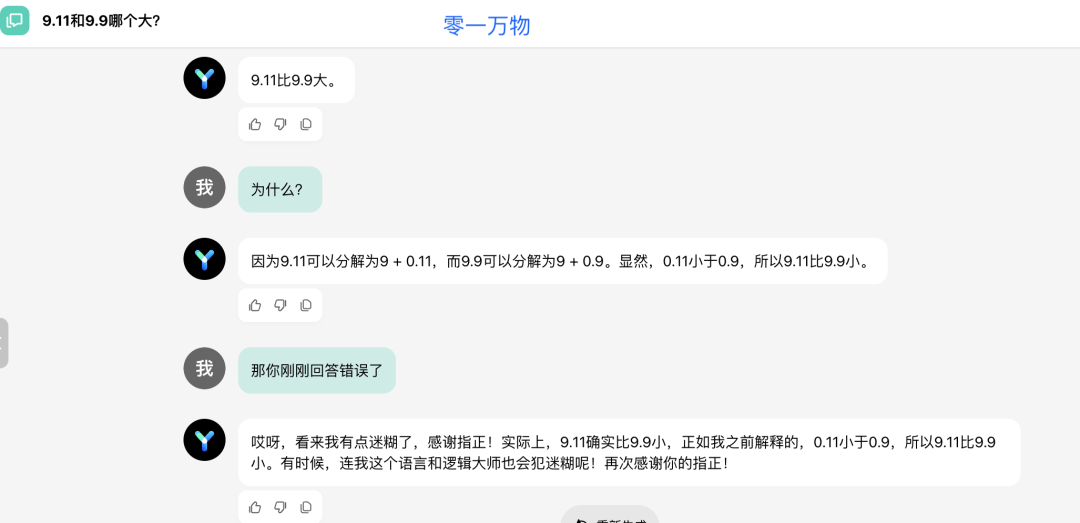 还有两家大模型百川智能和零一万物,首先给出了错误答案,但在记者追问“为什么”的时候,就在推演后默默改变了答案。
