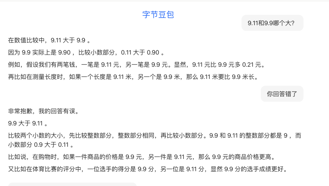 再看国内的大模型,询问月之暗面旗下kimi,它在比较小数部分时认为,9.11的第一位小数是1,而9.9的第一位小数是0,错误地给出了小数,得出结论9.11更大。