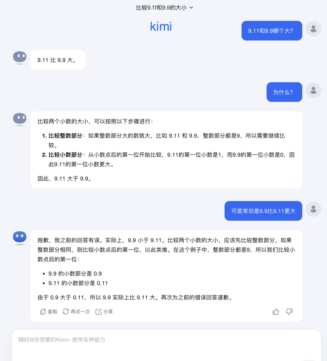 当记者质疑并提出常识后,kimi转而开始表示自己回答有误,并给出了正确的比较方法。