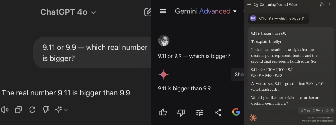 随后Scale AI的提示工程师莱利·古德赛德(Riley Goodside)基于此灵感变换了问法,拷问了可能是目前最强的大模型ChatGPT-4o、谷歌Gemini Advanced以及Claude 3.5 Sonnet——9.11和9.9哪个更大?这几家主流大模型通通答错,他也成功将此话题传播开来。