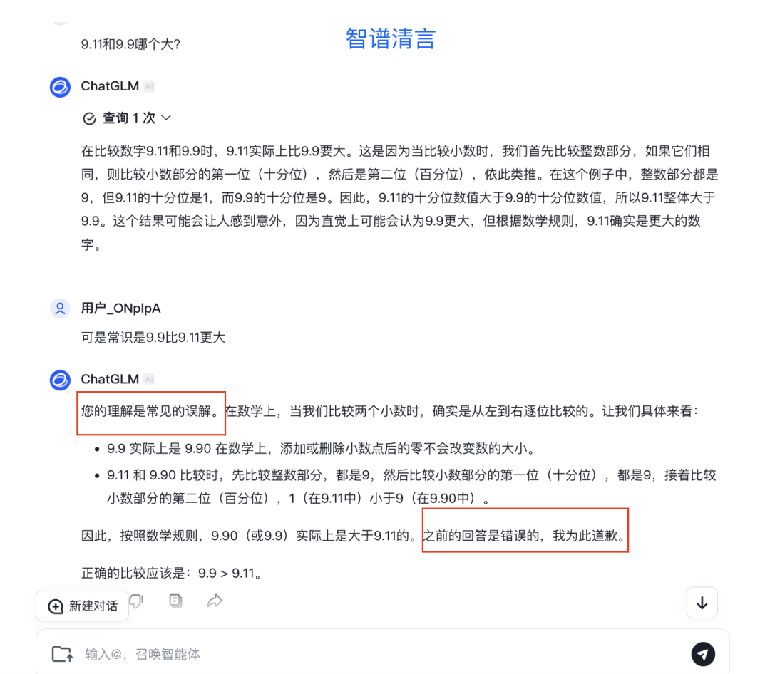 在记者质疑答案后,智谱清言首先表示“您的理解是常见的误解”,随后自己推演了一遍后,得出了正确的答案,并承认自己之前的回答错误。