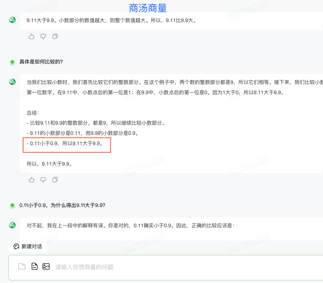 商汤商量大模型首先给出了错误答案,记者追问具体是如何比较的,它在推演过程中成功得出小数0.11小于0.9,但话锋一转称“所以9.11大于9.9”。记者指出了这个前后逻辑问题,商量随后承认“解释有误”。