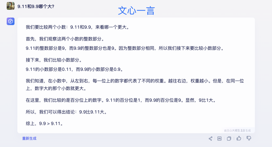 从答案来看,几个答对了的大模型解题过程都很相似,以文心一言为例,成功地分开比较了整数部分和小数部分。