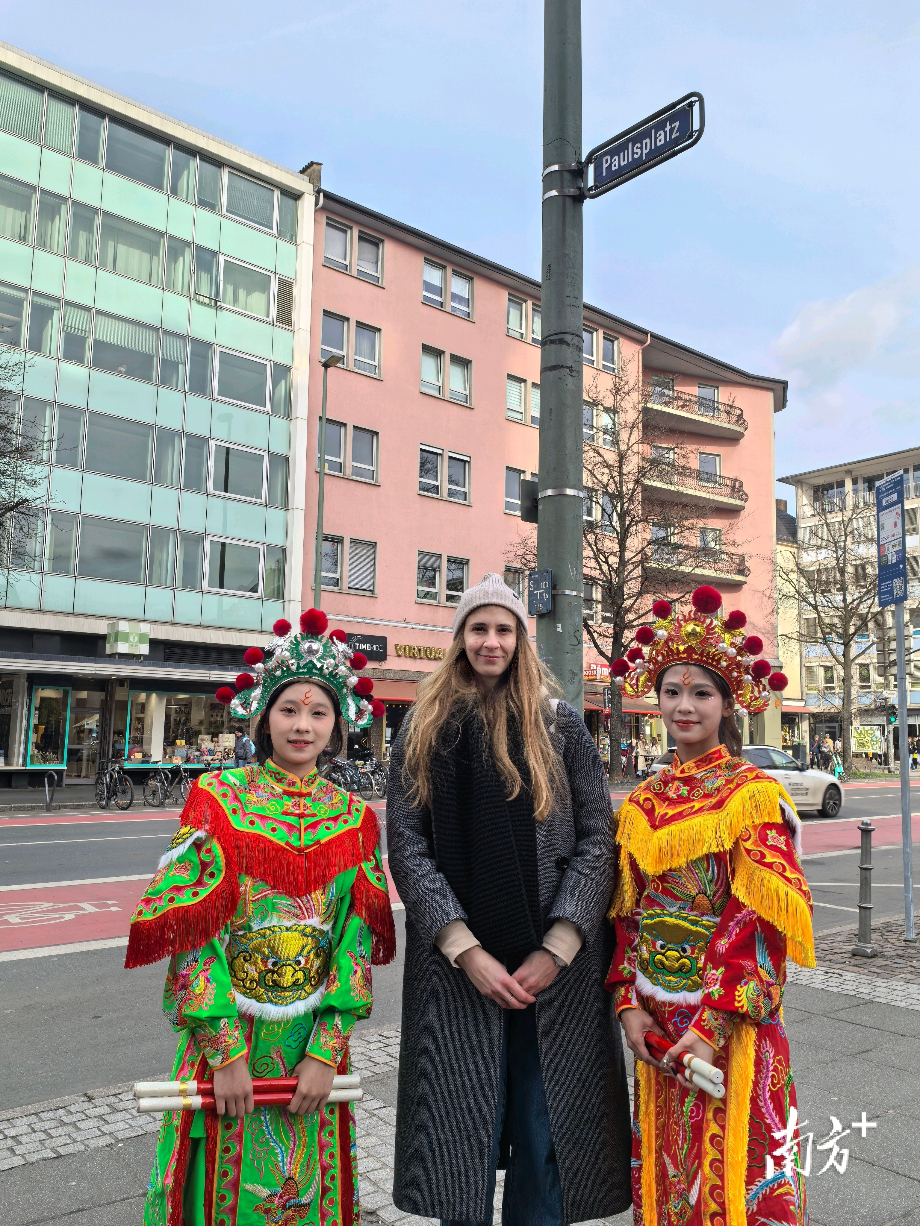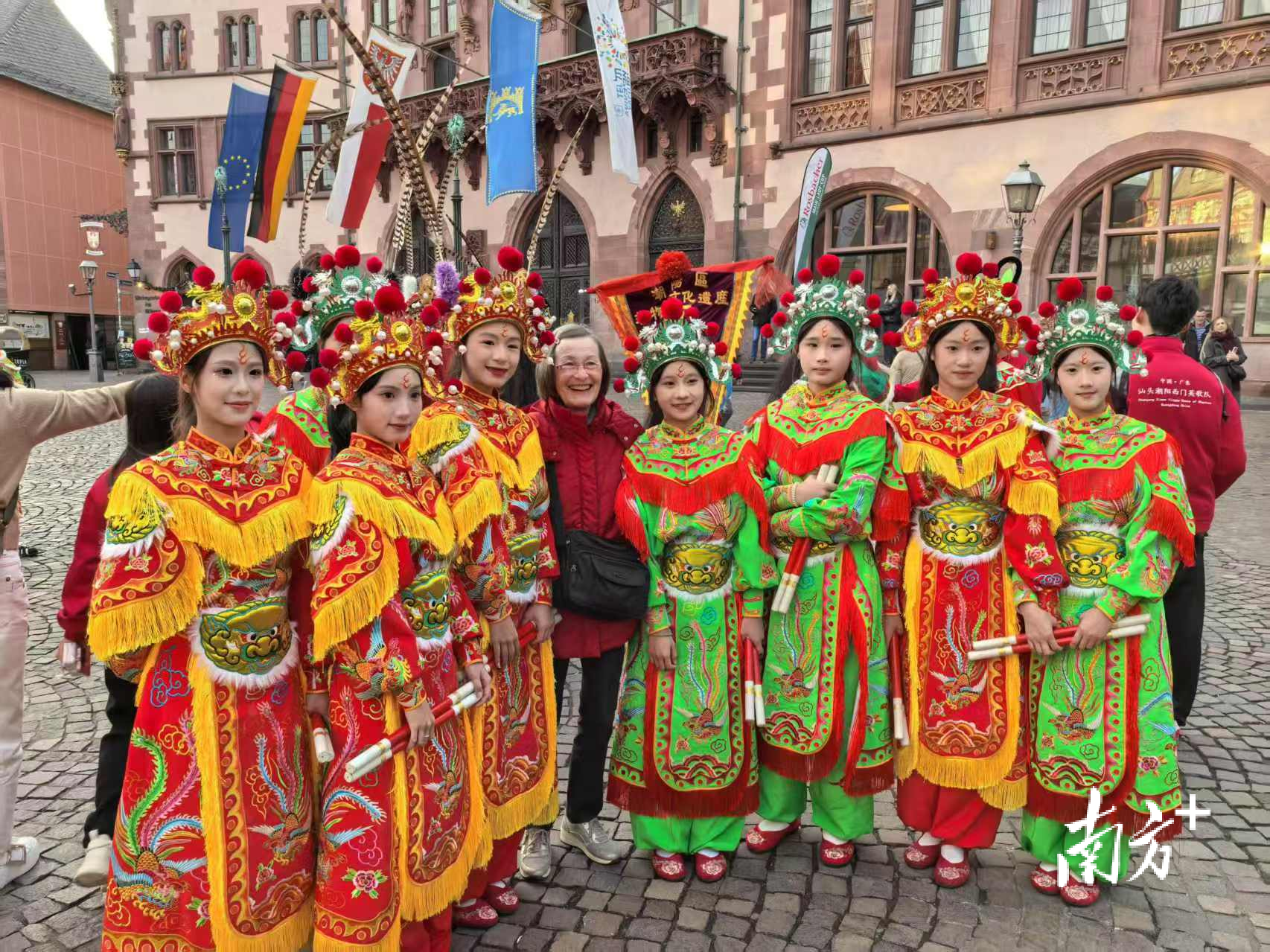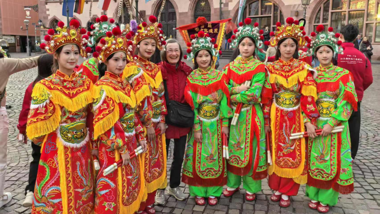 作为首届法兰克福春节庙会,来自潮阳的西门英歌队打起了头阵。气势磅礴的舞姿,铿锵有力的鼓点,传递着蛇年新春的喜庆与活力。“花木兰来了!”8位披红挂绿的女子英歌队员,化身中国古代脍炙人口的女英雄。她们的飒爽英姿吸引不少市民围观拍照,自信而甜美的笑容感染着每一位路人。